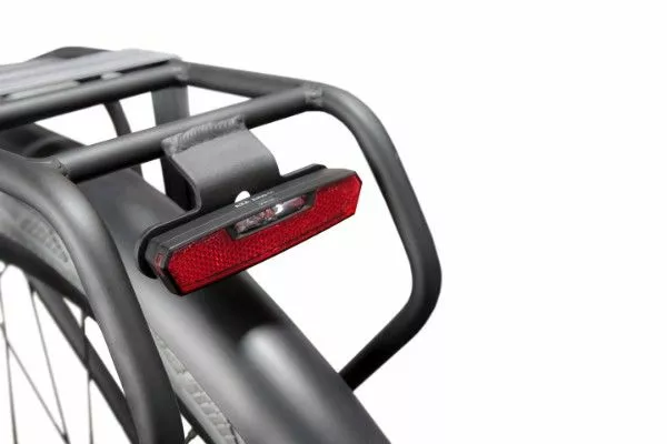 AXA Juno E-bike er en meget kompakt baglygte. Det smarte design byder også på lys fra siden, som gør dig mere synlig for krydsende trafik.