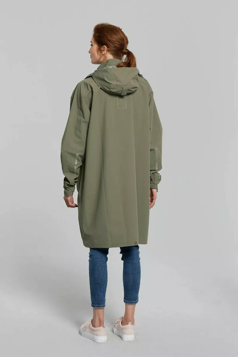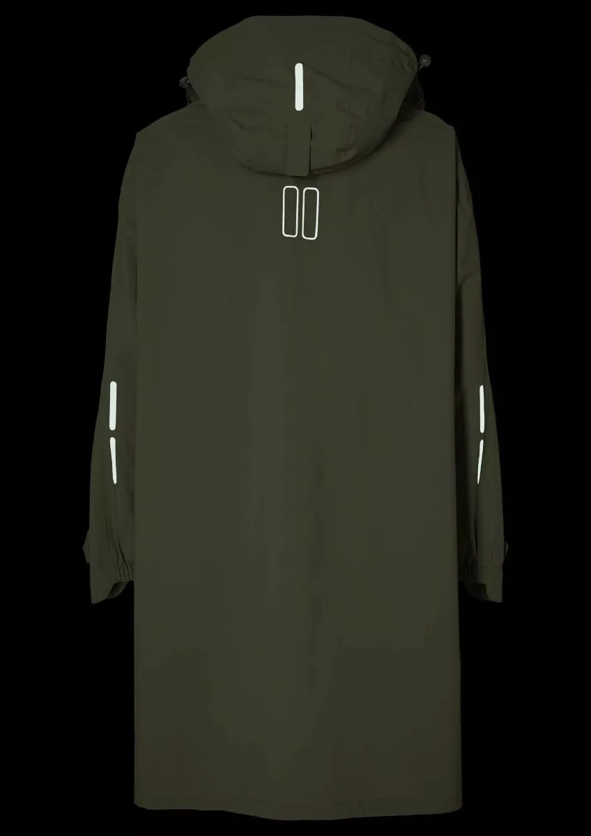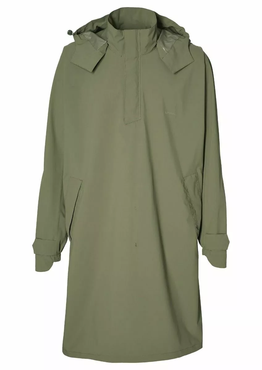 Den rummelige lukning, sidelommer og tone-til-tone reflektion bidrager til komfort, bærekomfort og trafiksikkerhed. Den forreste og bageste del af ponchoen kan tilsluttes med en snapknap. Benene forbliver beskyttet, og det forhindrer, at der sprænges i en stærk vind. En-ponchoen i farve olivengrøn kommer med en pose.