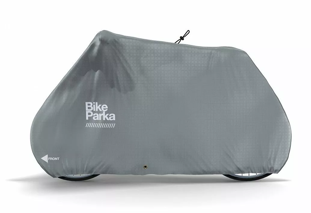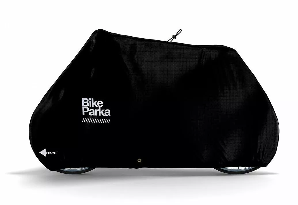 Hver BikeParka justeres til at sidde lidt forskelligt på hver cykel, for at give mulighed for at passe på forskellige rammestørrelser, styr- og sadelhøjder. For at sætte BikeParka på din cykel, sæt blot betrækket under forhjulet og træk det tilbage over din cykel. Du kan derefter justere toppen for at give ekstra slæk til venstre eller højre.
