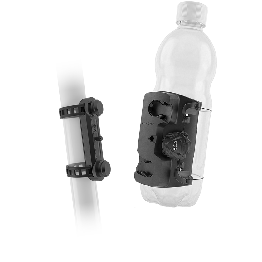Flasken puttes i sin holder, du spænder BOA lukningen og så er du klar. Selve holderen afmonteres ved at dreje den, og så klikker den nemt af. Skal den på igen – så sætter man den lige på basen. Du er helt fri for af have en seperat flaskeholder til din thermo kaffekop monteret på cyklen.
