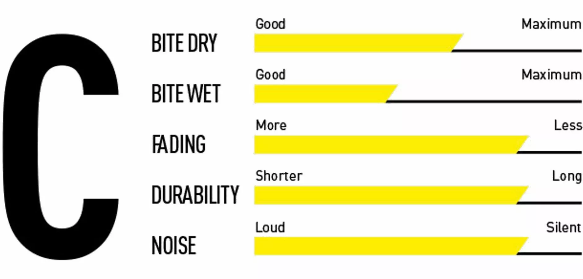 - RACE: For alle dem, der bringer deres udstyr til deres grænser under XC eller ned ad bakke og kræver fremragende bremseevne. Maksimal bid, men lavere holdbarhed. Bedste bid på våde betingelser.