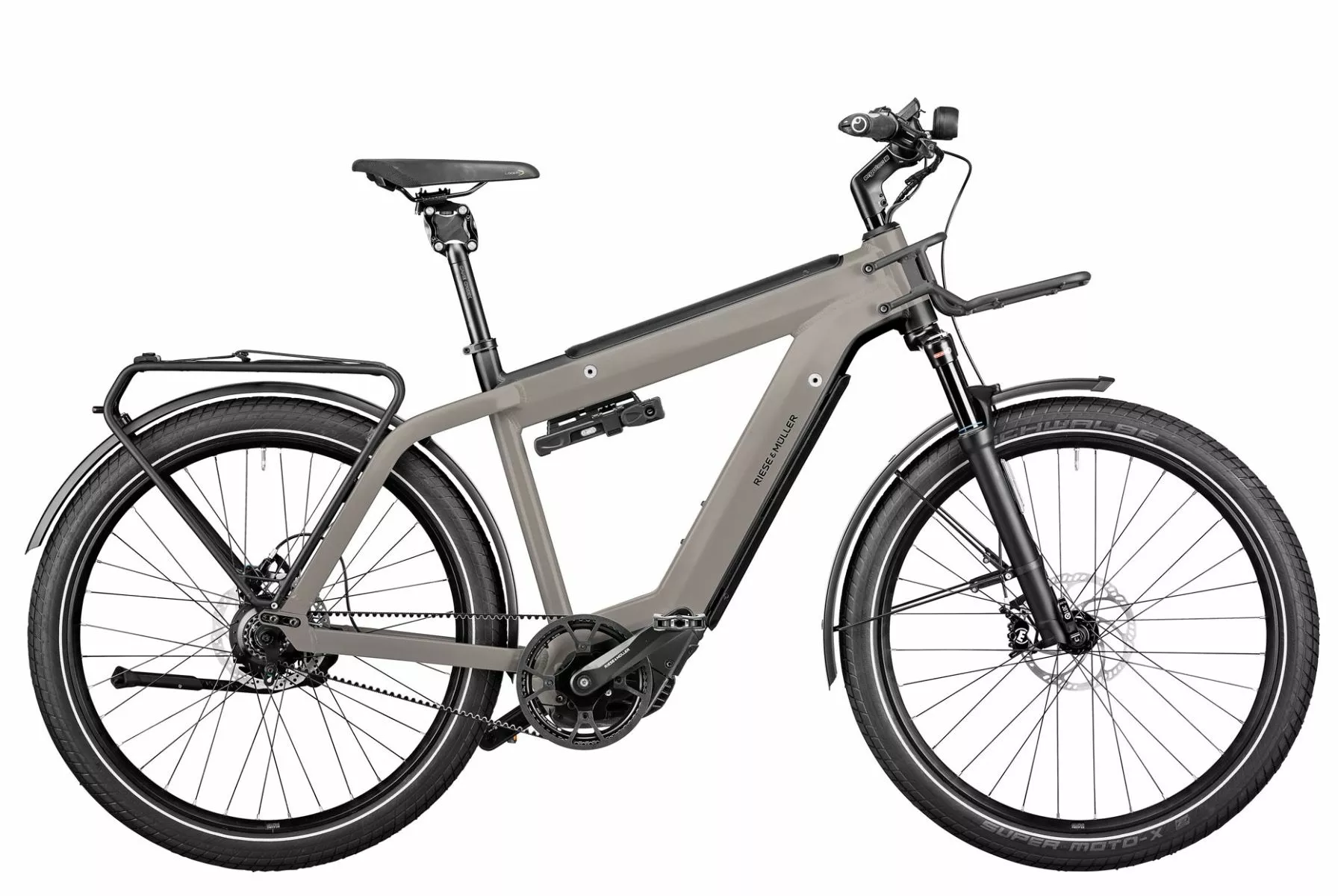 Riese & Müller Supercharger GT Rohloff fås i 4 størrelser, 2 farver og er udstyret med 14 indvendige Rohloff gear i elektronisk version, Suntour Aion LO-R olie baseret affjederet forgaffel, Magura MT4 hydrauliske skivebremser, Supernova M99 Mini Pro-25 forlygte og Busch & Müller baglygte, MIK bagagebærer og så har den 27,5″ hjul monteret med Schwalbe Super Moto-X 62-584 – det vi hos EBIKECENTER også kalder “chubby-tires”. Du får de nye Supercharger med det nye kabel/lednings integeret Cockpit, hvor kan vælge imellem Bosch Intuva, Kiox eller det nye Nyon2 display.