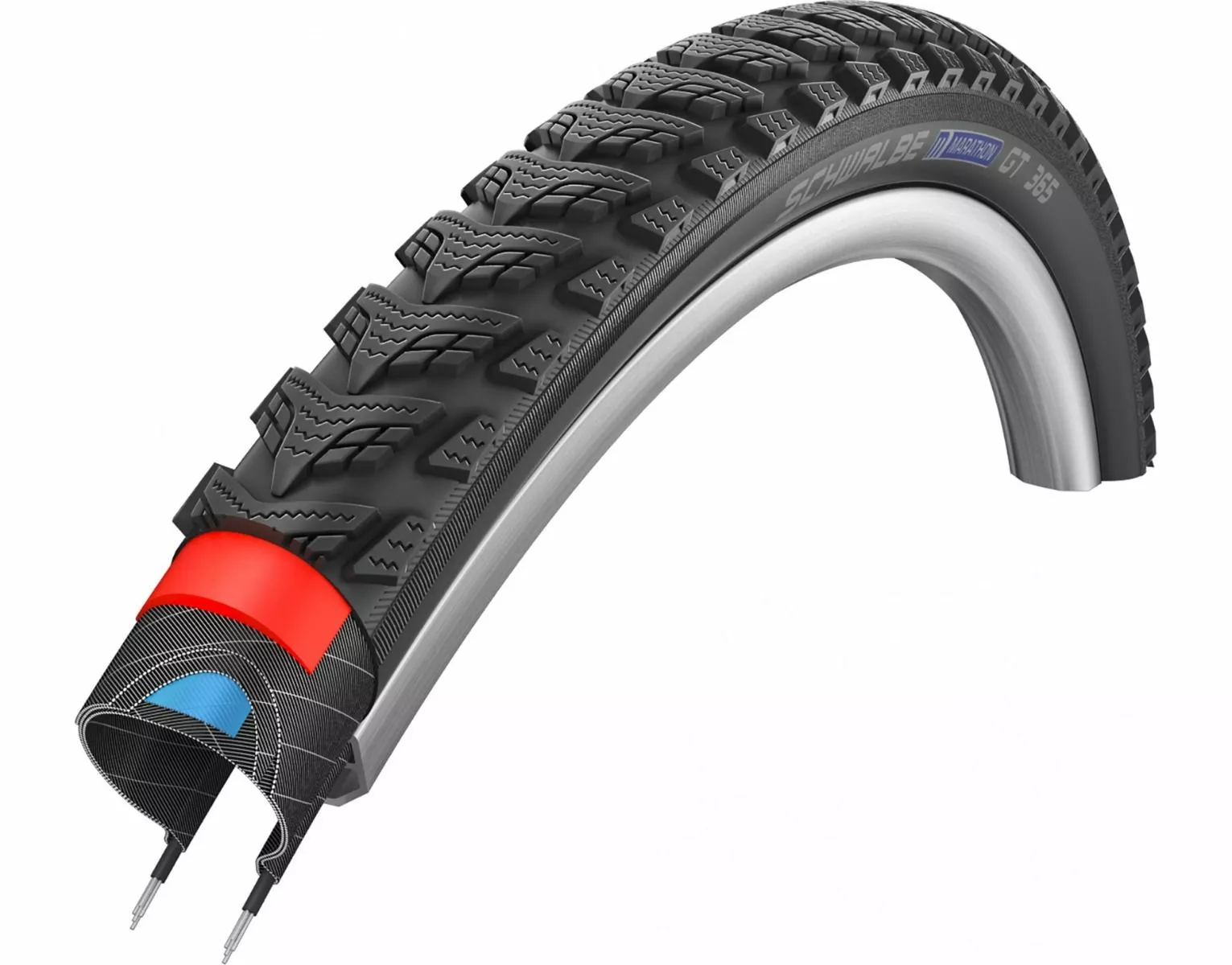 Schwalbe Marathon GT365 – 1 dæk. 4 årstider, 365 dage uden behov for dækskift. Marathon GT 365 er det første cykeldæk, som man kan køre sikkert på året rundt under stort set alle forhold. Den nye slidbane med lameller og den specielle ”Four Season” gummiblanding giver sikkert vejgreb uanset hvornår på året, man skal ud at cykle. Selvfølgelig med DualGuard punkteringsbeskyttelse for maksimal sikkerhed. Punkteringsfrit til niveau 6 af 7 og er selvfølgelig E50 mærket til brug på elcykler.